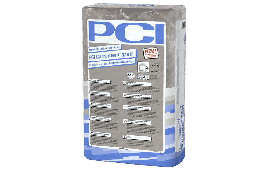 Die PCI Augsburg GmbH hat den bewährten Mittelbett- und Ansetzmörtel PCI Carrament® grau für Naturstein- und Feinsteinzeugbeläge weiter optimiert. Mit neuer Rezeptur bietet PCI Carrament® grau den Handwerkern noch mehr Verarbeitungskomfort und Zeitersparnis und sorgt gleichzeitig durch seine neue, frische Verpackungsoptik für zusätzliche Aufmerksamkeit im Handel und auf der Baustelle.