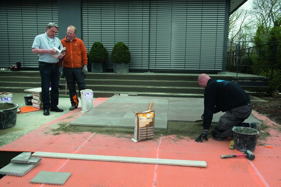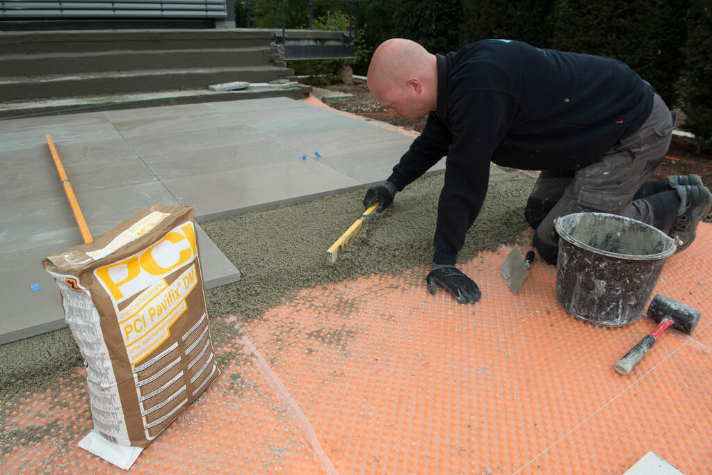 An der Rückwand einer Nische im Eingangsbereich ist ein Mosaik zu entdecken – in schwarz-goldfarbigem Naturstein, Fliesenmaß ca. 1 x 1 cm. Auf dem Boden verläuft der Belag aus Quarzit Naturwerkstein vom Wohnbereich bis auf die Terrasse hinaus. So scheint die Grenze zwischen drinnen und draußen nahezu aufgehoben, wenn man im Sommer die bodentiefen Fenster zur freistehenden, etwa 200 m2 großen Terrasse hin öffnet. Bei den Verlegearbeiten dichteten die Verarbeiter die abfallende Betonplatte sowie die Stufen mit PCI Seccoral 2K Rapid inklusive Systemdichtbändern ab. Es folgte eine Einkornmörtelmatte, darauf kam der Monokornmörtel PCI Pavifix DM in einer Stärke von 5 cm zur Anwendung. Mittels einer 6 mm Rechteckzahnung wurde PCI Carraflott NT rückseitig auf den Natursteinplatten aufgezahnt und in den frischen Einkornmörtel eingeklopft. Anschließend verfugten Wyß und sein Team das Ganze mit der drainagefähigen Pflasterfuge PCI Pavifix 1 K Extra. Derart verarbeitet trotzt die Terrasse allen klimatischen Belastungen und mechanischen Beanspruchungen.