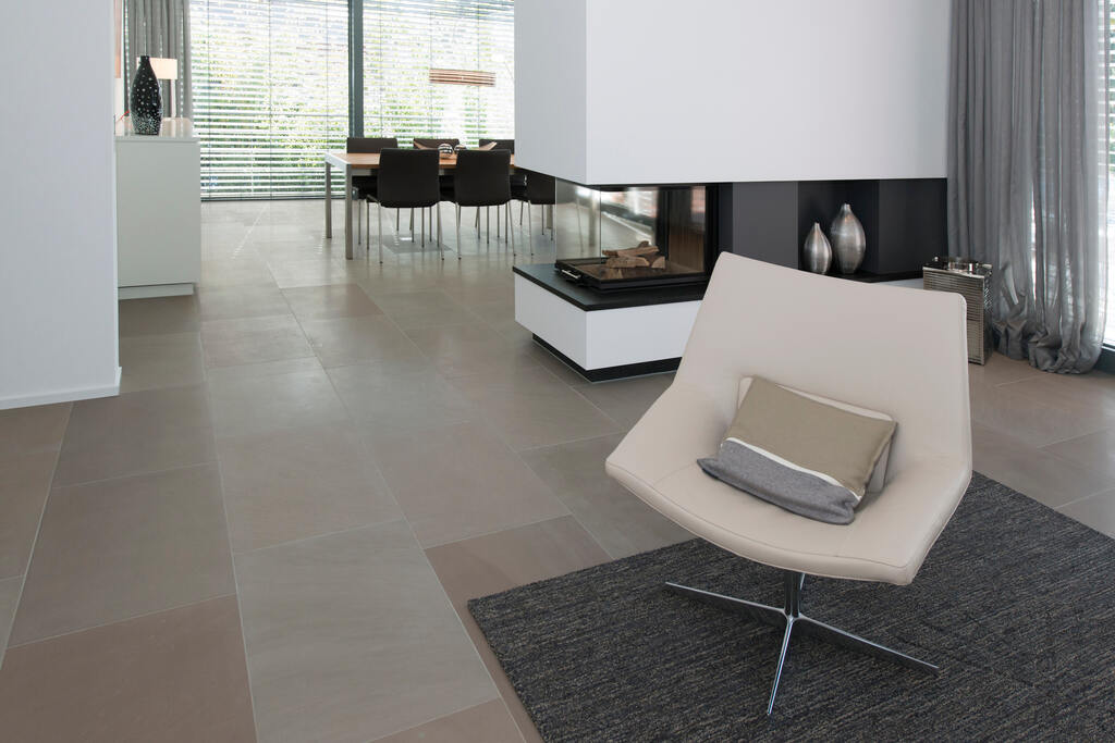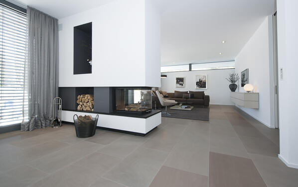 Im weitläufigen Wohnraum im Erdgeschoss einer Stadtvilla in Krefeld lassen große bodentiefe Fenster viel natürliches Licht herein. Der hochwertige Naturwerksteinbelag unterstützt den Eindruck von Großzügigkeit und Luftigkeit und setzt sich vom Innenbereich aus konsequent nach außen fort. Insgesamt 400 m2 kalibrierter Quarzit Naturstein wurden dazu verlegt: 200 m2 im Wohnbereich, 200 m2 im Bereich der Terrasse. Durchgehendes Format 50 x 80 cm, im Innenbereich 2 cm stark, im Außenbereich laut Regelwerken 3 cm stark. Zunächst flieste Unternehmer Benjamin Wyß zusammen mit zwei von ihm beauftragten Subunternehmern die Badezimmer. Zum feuchtigkeitsbremsenden Verfestigen erfolgte dazu die Grundierung der Estriche mit PCI Gisogrund. Die 1 cm starken Feinsteinzeugfliesen (60 x 120 cm) im Badezimmer des 1. OG verlegten die Profis an Wand und Boden mit PCI FT Flex. Im Badezimmer und im Gäste-WC des Erdgeschosses wurden passend zum durchgängigen Fliesenkonzept der Etage Quarzit Naturwerksteinbeläge verlegt. Dabei wurde PCI Carraflott NT verwendet. Bei der Ausführung der Fugen kam PCI Carrafug zum Einsatz.