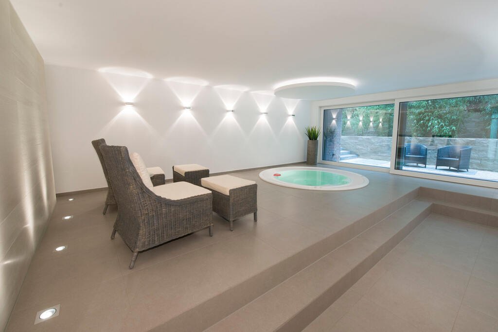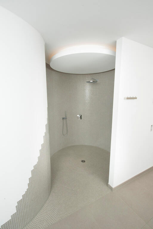 Der Treppenaufgang zwischen Erd- und Untergeschoss ist mit Feinsteinzeug im Format 60 x 120 cm und exakt aufs Treppenmaß geschnitten, gefliest. Die Räume im Keller sowie das Bad der in den Keller integrierten Anliegerwohnung wurden mit Feinsteinzeug in den Formaten 60 x 60 cm und 60 x 90 cm ausgestattet. Herzstück ist hier der aufwendig gestaltete Spa-Bereich. Hier sind ein rund 350 x 350 cm großer Whirlpool und eine Runddusche integriert. Wyß grundierte dazu den Estrich zunächst mit PCI Gisogrund Rapid vor. Anschließend wurde mit PCI Rapidlight eine Klebeschicht für die Abdichtungs- und Entkoppelungsmatte PCI Pecilastic U aufgezogen. Die Bahnenstösse wurden mit PCI Pecitape 120 und PCI Seccoral 2K Rapid überarbeitet, gleiches im Sockelbereich und an den Anschlüssen wie dem Pool. Im Wandbereich verwendeten die Verlege-Profis PCI Lastogum auf vorgrundierten Untergrund. Im Sockel wurden beide Abdichtungen über das Dichtband miteinander verbunden. Die Abdichtung der Dehnungsfugen sowie der Anschlüsse zwischen Wand und Boden erfolgte mit PCI Silcoferm S. Verfugt wurde mit dem flexibilisierten Fugenmörtel PCI Nanofug.