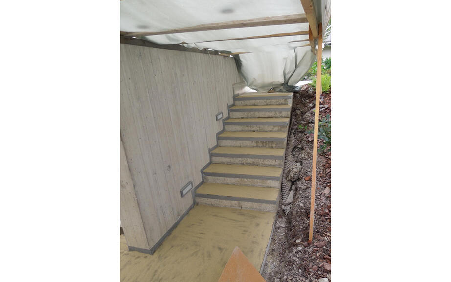 Wenn Bauherren eine Betontreppe im Aussenbereich ihres Gebäudes sanieren lassen, erwarten sie eine dauerhafte Massnahme. Nicht zuletzt, weil eine solche Sanierung eine erhebliche Investition darstellt. Wichtig ist deshalb, das Thema Lebensdauer der Sanierungsmassnahme sowie Unterhalt vorab mit allen Baubeteiligten zu besprechen. Das Erscheinungsbild spielt bei aussenliegenden Treppen ebenso eine Rolle, da sie vielen Blicken ausgesetzt sind. Ausserdem ist der Abstand Auge zu Treppenoberfläche beim Treppensteigen gering und die Gehgeschwindigkeit moderat. Jede optische Unregelmässigkeit oder Verschmutzung fällt verstärkt ins Auge. Unabhängig vom eingesetzten Material sind Struktur- und Farbunterschiede jedoch typische Merkmale einer Betoninstandsetzung, die im Treppenbereich oft Handarbeit ist.