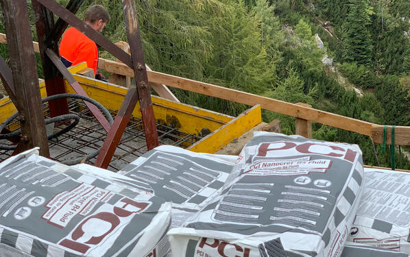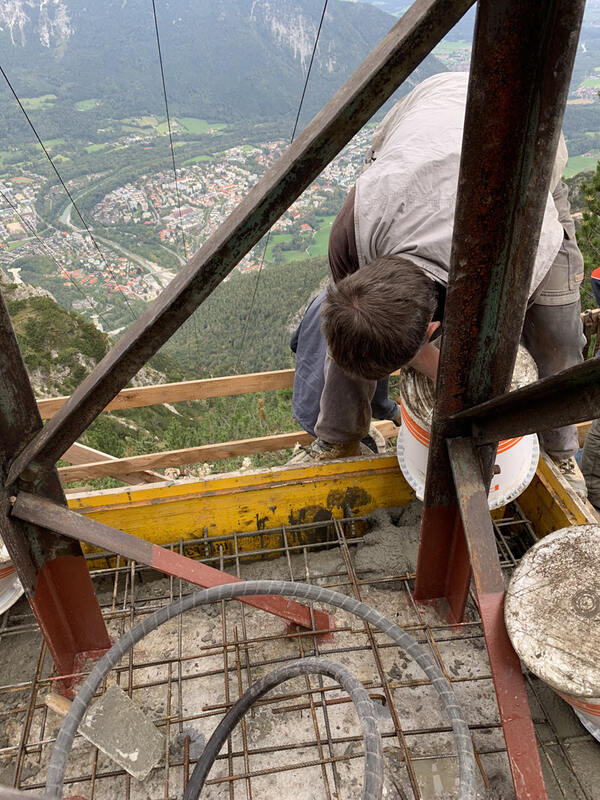Die Stromleitungen führen auf einer Länge von rund 2400 Metern auf den Predigtstuhl. Neben der Hauptstütze befinden sich im oberen Drittel des Berges zwei weitere Masten der Stromtrasse in fast unzugänglichem Gelände. Ihre beiden Sockel waren jedoch komplett marode. Bei ihrer Errichtung hatten die Bauarbeiter das Material noch zu Fuß auf den Berg getragen, entsprechend füllten sie fehlende Bausubstanz mit dem auf, was sie in der Höhe vorfanden: Steine und Geröll. Der Einsatz eines Helikopters machte die Sanierung 2018 zwar deutlich einfacher, dennoch war die Logistik eine Herausforderung. Sechs Helikopterflüge waren notwendig, um die vier Tonnen an Baustoffen, allesamt von PCI, nach oben zu befördern. Und auch der Weg zur Baustelle war für Verarbeiter Josef Unterrainer sowie PCI-Fachberater Marcus Donhauser und PCI-Servicetechniker Jürgen Linke ein Abenteuer: Sie mussten einen halbstündigen Abstieg von der Bergstation durch völlig unwegsames Terrain bewältigen.