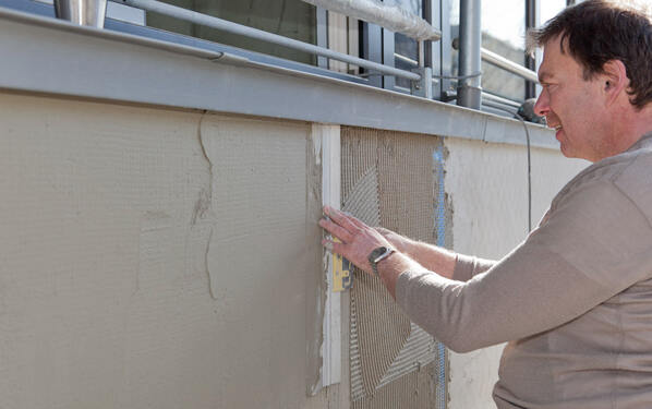Auf dem insgesamt 120 m² großen Betonuntergrund führten die Fliesenleger zunächst Ausbesserungsarbeiten und die Egalisierung von Unebenheiten mit dem PCI Fassadenspachtel aus. Eine dünne Kontaktschicht wurde anschließend mit dem PCI Fassadenkleber aufgezogen und die armierten CeraVent Bekleidungsträgermatten direkt in der aufgekämmten Kleberschicht fixiert. Gemäß Dübelplan verankerten die Verarbeiter die CeraVent Systemdübel im Untergrund und spachtelte die Matten dann vollflächig mit PCI Fassadenspachtel aus. Während der Trocknungszeit konnten die Be- und Entlüftungsprofile von Gutjahr gesetzt werden. Durch die Belüftung und Entkopplung des keramischen Belags vom Untergrund werden Schäden, die bei einer direkten Verlegung drohen, dauerhaft vermieden. Im nächsten Schritt wurde eine ca. 4 mm dicke Schicht mit dem PCI Fassadenspachtel aufgezogen und das CeraVent Armierungsgewebe eingebettet. Auf der durchgetrockneten Armierungsschicht verlegte Karsten Ramlow mit seinen Mitarbeitern die großformatigen Fliesen der Serie KerAion mit PCI Fassadenkleber und führte die Verfugung der Belagsfugen mit PCI Fassadenfug aus. Bewegungs- und Anschlussfugen wurden zunächst mit PCI Elastoprimer 145 vorbehandelt und anschließend elastisch mit dem PU-Dichtstoff PCI Elritan 100 geschlossen. Die Bilanz nach der Durchführung der Arbeiten war durchwegs positiv: Die Balkongestaltung war fachlich wie auch optisch rundum gelungen und für Kasten Ramlov und sein Team eine erste gute Referenz für Folgeprojekte mit dem CeraVent Fassadensystem.