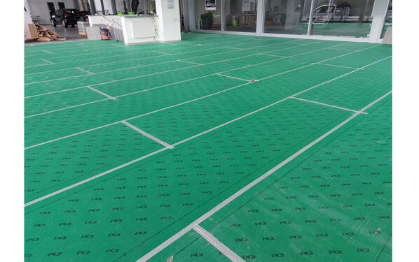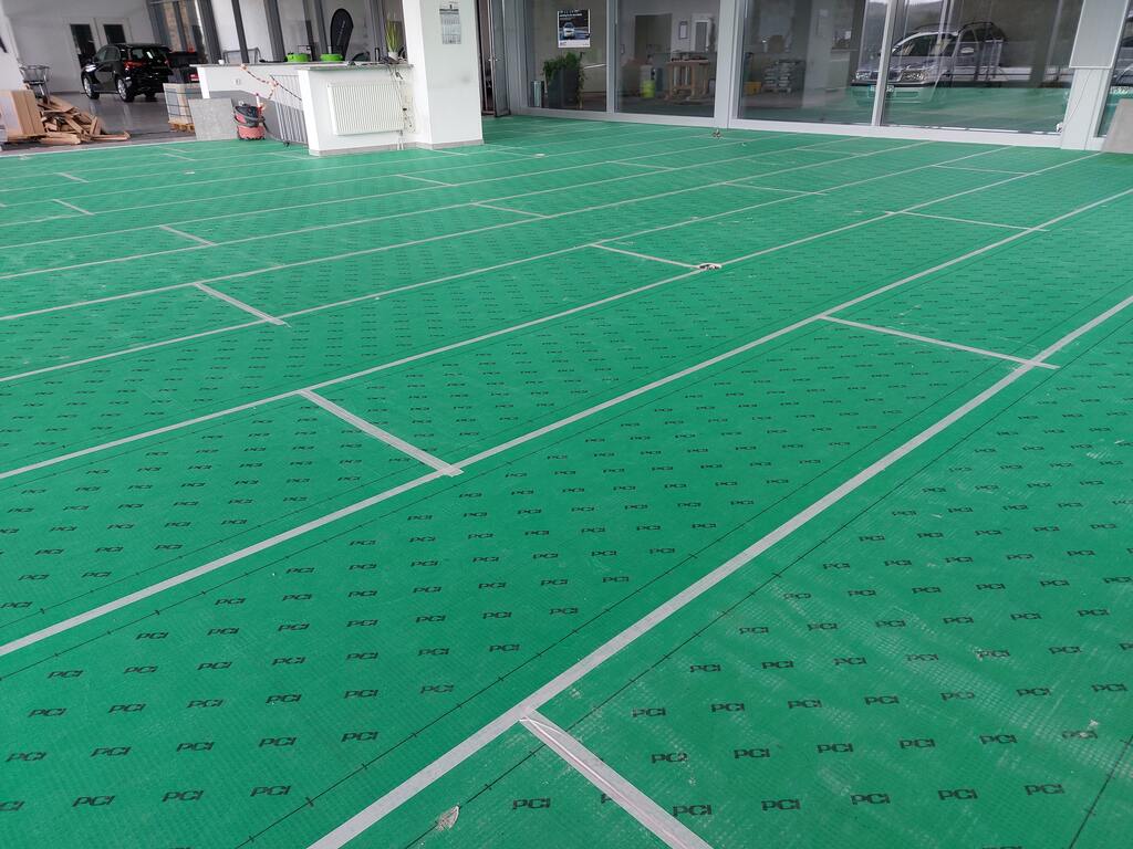 Voraussetzung für die sichere Fliesenverlegung ist immer, dass der Untergrund sauber, fettfrei, fest, tragfähig und frei von haftungsmindernden Oberflächenschichten vorliegt. Den so vorbereiteten Untergrund grundierten die Handwerker mit PCI Gisogrund 404, einer Spezialgrundierung für saugende und nicht saugende Untergründe wie etwa keramische Fliesen. Auf die getrocknete Grundierung folgte die Entkopplungsmatte PCI Pecilastic E, die Spannungen, Untergrundverformungen und Temperaturschwankungen ausgleicht. PCI Pecilastic E nimmt die Bewegungen aus den Fugen auf und verlagert diese – und verfügt damit über alle erforderlichen Eigenschaften für die nachfolgende Fliesenverlegung im Autohaus. Praktisch ist zudem die einfache und schnelle Verarbeitung: Die Entkopplungsbahn ist gebrauchsfertig und wird direkt auf den Untergrund aufgeklebt. Das Abdecken der Stöße erfolgt mit einem Krepp- bzw. Klebeband. Nach ausreichender Erhärtung des Klebers können die Handwerker die Fliesen darauf verlegen, im A.M.T. Autohaus war das nach rund zwei Tagen der Fall.