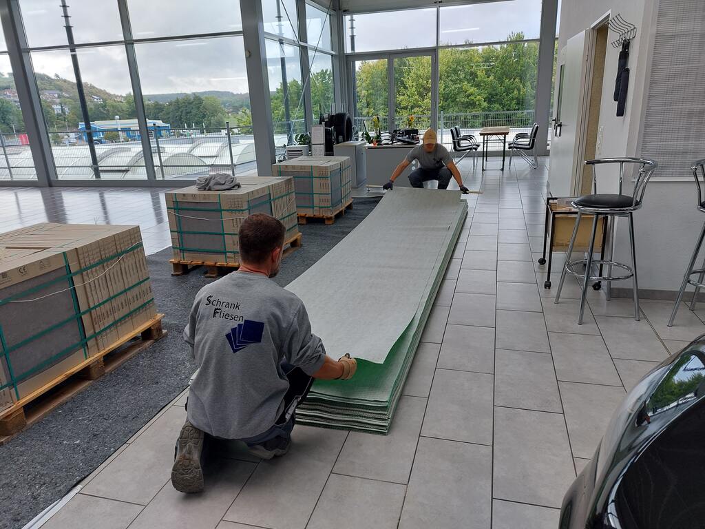 Im A.M.T. Autohaus im unterfränkischen Erlenbach sollte ein neuer Fliesenbelag in einem Teilbereich des Showrooms auf dem bestehenden Keramikbelag verlegt werden. Für die beauftragte Schrank-Fliesen GmbH war es bereits das fünfte Autohaus mit dieser Anforderung. Fliese auf Fliese zu verlegen erfordert zunächst die genaue Prüfung des Untergrunds. Sind unterschiedliche Untergründe vorhanden? Ist der alte Fliesenbelag intakt und fachgerecht verlegt oder weist er Schäden oder Hohllagen auf? Ebenso ist zu prüfen, ob es einen Versatz gibt, also Höhenunterschiede durch Estrichfelder, und Fugen dadurch gerissen sind. Und nicht zuletzt müssen Verarbeiter auch klären, wie sich Bewegungsfugen verlagern lassen, wenn alter und neuer Fliesenbelag nicht dasselbe Format haben, so wie es z.B. im A.M.T. Autohaus der Fall war. Dort sollten auf die 30 x 60 Zentimeter großen Fliesen neue 60 x 60-Zentimeter-Fliesen verlegt werden.