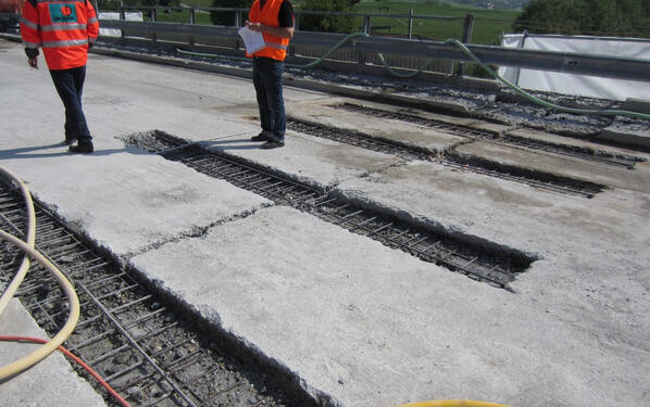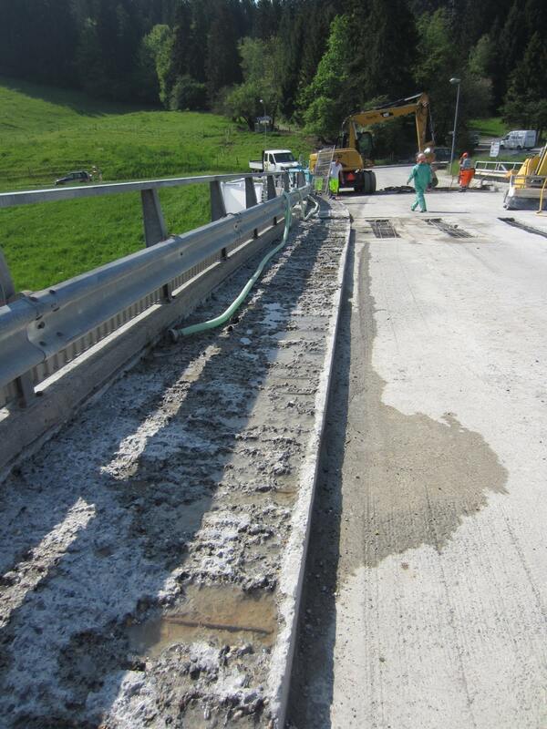 Im Zuge von Instandsetzungsmaßnahmen wurde das statische System der Brücke „Pont de Loveresse“ in Reconvilier (Schweiz) umgestellt. Ein wichtiger Punkt für diese Umstellung war die Versteifung der Gerbergelenke. Im ersten Schritt legten die Bauprofis der Bauunternehmung De Luca S.A. dazu durch Höchstdruckwasser-strahlen bis 2.000 Bar selbst engste Zwischenräume frei und reinigten sie. Im nächsten Schritt öffneten sie an mehreren Stellen der Fahrbahn den Straßenbelag, so dass die entstandenen Schlitze die Fugen der Gerbergelenke kreuzten. Auf diese Weise erhielt jedes Gelenk vier Einkerbungen, deren Armierung die Zugkräfte der Konstruktion später aufnehmen sollte. Die freigelegten Gerbergelenke verfüllten die Spezialisten mit dem hochfesten, selbstverdichtenden Reparaturmörtel PCI Nanocret R4 Fluid. Da das Material ein sehr gutes Fließverhalten aufweist, füllte es die engen Zwischenräume ohne Probleme hohlraumfrei aus. Im Anschluss daran erfolgte die Armierung auf der Fahrbahn. Dabei wurde Bewehrungsstahl in die zuvor erstellten Einkerbungen eingelegt. Die etwa zehn Zentimeter tiefen, 30 Zentimeter breiten und vier Meter langen Schlitze füllten die Profis mit dem fließfähigen Reparaturmörtel PCI Repafast Fluid. Das Material verankerte den Bewehrungsstahl in der Fahrbahn.