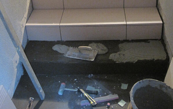 Untergrundvorbereitung, Einbau einer elektronischen Außenheizung, Abdichtung und Fliesenverlegung auf der Außentreppe und den Verbindungsgängen