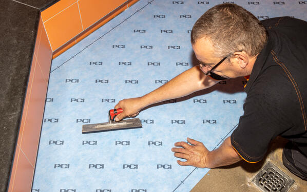 Auf dem Boden des Dampfbads erstellte Wolfgang Peters die Abdichtung mit PCI Apoflex® F. Anschließend klebte er darauf die Abdichtungsbahn PCI Pecilastic® W mit dem leichten variablen Flexmörtel PCI Nanolight® als zusätzliche Entkopplung. Diese Vorgehensweise ermöglicht eine schnelle Arbeitsabfolge: Ohne Trocknungszeiten kann der nachfolgende Keramik- oder Naturwerksteinbelag sofort aufgebracht werden. Auch PCI Pecilastic® W hat das allgemeine bauaufsichtliche Prüfzeugnis für die Beanspruchung A, B und C und eignet sich speziell für Dampfkabinen (Wassereinwirkungsklassen W2-I oder W3-I gemäß DIN 18534). Pecilastic® W ist wie der Flexmörtel PCI Nanolight® sehr emissionsarm nach GEV EMICODE EC1 PLUS.