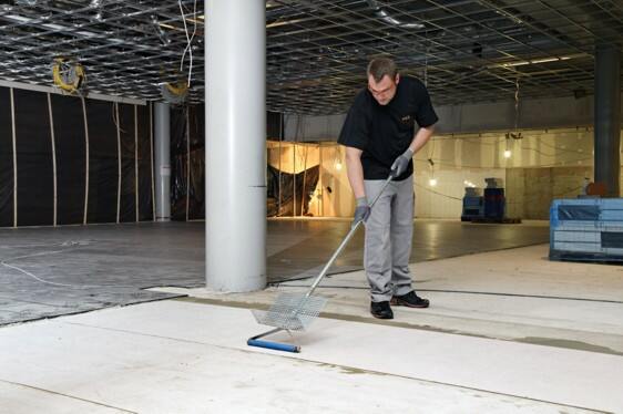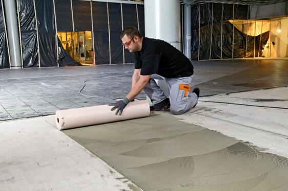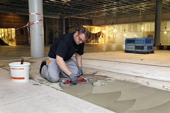 Der vorhandene, fest sitzende Terrazzobelag wurde sandgestrahlt und mit der Spezial-Haftgrundierung PCI Gisogrund 404, 1:1 mit Wasser verdünnt, grundiert. Um einen absolut planebenen Untergrund zu schaffen, wurde die komplette Verlegefläche mit PCI Nivelliermasse im Mittel zwischen 3 bis 10 mm überspachtelt. Aufgrund der großen Fläche und Menge an zu verarbeitender Nivelliermasse brachten die Handwerker die Spachtelmasse mittels Pumpen auf. Dann folgte die vollflächige Verklebung des Entkopplungsgewebes PCI Pecilastic mit dem flexibilisierten Fliesenkleber PCI FT Extra. Diese Vorgehensweise bietet eine zusätzliche Sicherheit und sorgt für das zuverlässige Entkoppeln unter Keramik- und Naturwerksteinbelägen. Bei der Verarbeitung sind Hohlstellen beim Eindrücken des Gewebes in den Kleber zu vermeiden. Für die möglichst hohlraumarme Verlegung der Fliesen kam der Klebemörtel PCI FT Extra im Buttering-Floating-Verfahren zur Anwendung. Die im Terrazzountergrund vorhandenen Bewegungsfugen wurden übernommen. Für das Verfugen verwendeten die Fachleute den schnellen Flexfugenmörtel PCI Rapidfug, der sich durch die geschmeidige Konsistenz komfortabel verarbeiten lässt und schnell erhärtet. Die Wartezeit zwischen Einfugen und Waschen des Belages ist dadurch äußerst kurz.