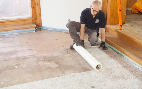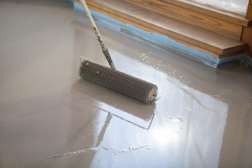 Die Untergrundsanierung stellte bei diesem Projekt eine besondere Herausforderung dar: Im Wohnzimmer war der Heiz-Estrich teilweise defekt und nur eine geringe Aufbauhöhe verfügbar. Den systematischen Aufbau führte der Fliesenleger auf Anraten von PCI-Anwendungstechniker Lukas Lukuc wie folgt aus: Mit PCI Gisogrund 404 erfolgte zunächst die Grundierung des Zementestrichs. Für den Verbundausgleich kam die Glasfaser-Verstärkung PCI Armiermatte GFM zum Einsatz, um die nachfolgende Bodenausgleichsmasse PCI Periplan Extra zu verstärken und deren Zugfestigkeit zu erhöhen. Die Ausgleichsmasse wurde auf dem Untergrund ausgegossen, mit einer Kufenrakel verteilt und mit der Stachelwalze entlüftet und fein nivelliert.