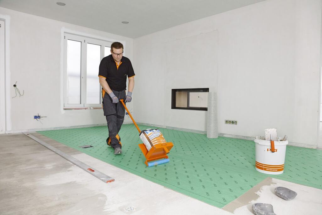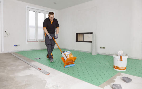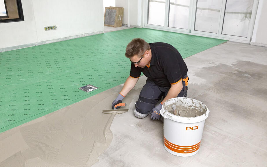 Für den Spannungsausgleich zwischen Untergrund und Bodenbelag verklebten die Fliesenleger die Entkopplungsbahn PCI Pecilastic E mit PCI Flexmörtel S2, in den Nassbereichen die sehr emissionsarme und wasserdichte Abdichtungs- und Entkopplungsbahn PCI Pecilastic U mit PCI Flexmörtel Nanolight. Die Entkopplungsbahnen lassen sich durch Aufkleben schnell und einfach verarbeiten. Das anschließende Festwalzen mittels der praktischen PCI Andrückwalze garantiert eine vollsatte Verklebung. Zum Abdichten in den Bädern trugen die Handwerker zusätzlich die schnellabbindende Sicherheits-Dichtschlämme PCI Seccoral 2K Rapid auf.