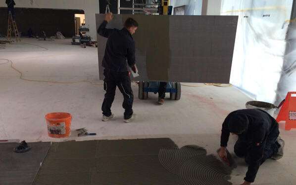 Professionelle Fliesenverlegung im Betriebsrestaurant von F/LIST mit PCI-Produkten und Verlegekran