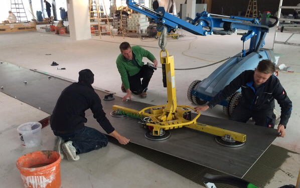Mit dem Verlegekran konnten die Arbeiten im Betriebsrestaurant schneller und vor allem leichter ausgeführt werden. Gerade das Anheben, Tragen und Positionieren von Großformaten stellt ein gesundheitliches Risiko für die Fliesenleger dar. Mit Maschinentechnik lässt sich der Arbeitsablauf beim Buttering-Floating-Verfahren zusätzlich verkürzen: Die Handwerker müssen die Platten zum Einstreichen der Rückseite nicht mühsam wenden und auch das Aufsetzen der Handsauger auf der Vorderseite entfällt. Platten, die schon in das Kleberbett eingelassen sind und der Korrektur bedürfen, lassen sich einfach und für die Handwerker rückenschonend anheben. Bei deutlich geringerer körperlicher Belastung entfallen Arbeits- und Wartezeiten.