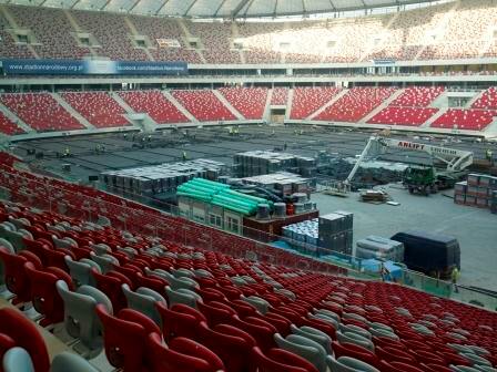 Warschaus nagelneues Nationalstadion zählt zu den modernsten Objekten dieser Art in Europa. Es bietet 58.000 Sitzplätze bei Fußballspielen und knapp 73.000 Plätze bei Konzerten. Ein technisches Highlight ist die heizbare Spielfläche über einer unbeheizten Tiefgarage. Dafür musste zwischen ihrem Deckenabschluss und den Heizschleifen eine leistungsstarke Dämmschicht eingezogen werden, damit die Wärme dorthin gelangt, wo sie tatsächlich benötigt wird. Aufgrund ihrer ausgezeichneten Wärmedämmung und hohen Druckfestigkeit kamen für die Dämmung des Ovals die großformatigen Glasschaumplatten der Glapor Werk Mitterteich GmbH zum Einsatz. Wegen seiner Haftungsfeindlichkeit und Sprödigkeit, muss Glasschaum während der Verlegung vollflächig in Bitumenkleber eingebettet werden. Die Glasschaumplatten wurden mit dem speziellen zweikomponentigen Bitumen Dämmplattenkleber PCI Pecimor DK der PCI Augsburg GmbH zusammengefügt.