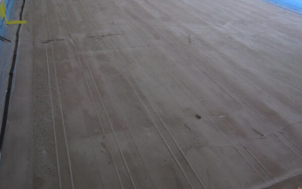 Dank einer ausgeklügelten Formel der PCI Bauprodukte AG konnte die notwendige Lastverteilschicht auf der Bitumenbahn mit nur 20 mm ausgeführt werden anstatt wie gemäss Norm verlangt mit ca. 70 mm. Weiterhin empfiehlt die PCI für einen dünnschichtigen Aufbau die Ausführung eines Spezial-Heizsystems, das mit einer faserverstärkten Fliessmasse PCI Periplan Extra einge- und übergossen wird. Die Dicke über den Heizrohren wird hierbei mit mindestens 5 mm vorgegeben. Dies ermöglicht Warmwasser-Fussbodenheizungen mit einer Schichtdicke von gesamthaft 15 mm auf tragfähigen Untergründe. In unserem Fall im Erdgeschoss wurde dieser tragende Untergrund durch die Lastverteilschicht vorgängig erstellt.