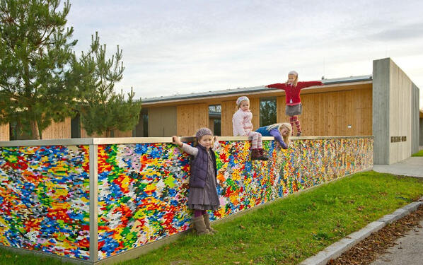 250.000 Legobausteine zieren die 26 m lange Brüstung im Eingangsbereich des Ingeborg-Ortner-Kinderhauses auf dem Hochschul- und Forschungszentrum der TU München in Garching. Die Künstlerin und Professorin Tina Haase kreierte diesen „realphantasierten“ Kindertraum, der beim Betreten des Kindergartens eine Art flash-back zur eigenen Kindheit vermitteln soll. Für die Grundierung und Verklebung der Legosteine kamen PCI-Produkte zum Einsatz.