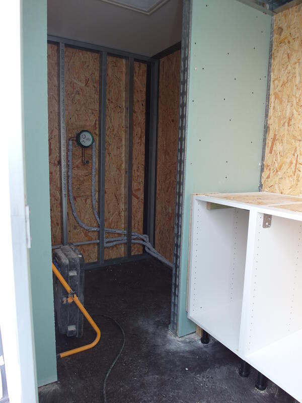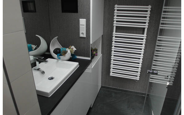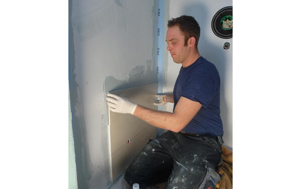 Gemeinsam mit Stefan Marx, Anwendungstechniker bei PCI, entwickelte Thorsten Verhoeven einen wasserdichten Plan für die Realisierung seiner Idee: Bevor die hochwertigen Wandfliesen verlegt werden konnten, galt es, speziell für den Einsatz im Transportbereich – z.B. im Schiffsbau – geeignete Verbundplatten mit einem Aluminium-Wabenkern anzubringen, um durch Schlaglöcher, Unebenheiten etc. hervorgerufene Vibrationen zu entkoppeln. Hierfür mussten die Wand-/Wandanschlüsse im Senkrechtbereich der Dusche fachgerecht mit dem Spezial-Dichtbandsystem PCI Pecitape abgedichtet werden. Eingebettet wurde dieses in den Polyurethan-Fliesenkleber PCI Ocean Flex PUR. Das Material wurde speziell für den Einsatz auf glatten, vibrierenden Untergründen wie Aluminium oder Stahl entwickelt. Nach Aufbringen des Dichtbandes ging es an die Fliesenverlegung. Hier sollten keramische Wandfliesen im Format 20 x 80 cm den Dampfduschbereich auch optisch zu einem Highlight machen. Um einen dauerhaften Halt des hochwertigen Materials zu gewährleisten und um zu verhindern, dass der Belag durch die zu erwartenden Erschütterungen geschädigt wird, setzte Thorsten Verhoeven bei der Verlegung ebenfalls auf den Reaktionsharz-Fliesenkleber PCI Ocean Flex PUR. Da der Fliesenkleber besonders schnell und schwundfrei aushärtet, konnten die Wände im Duschbereich bereits nach drei Stunden verfugt und die Eck- und Anschlussfugen anschließend mit dem Silikon-Dichtstoff PCI Carraferm geschlossen werden.