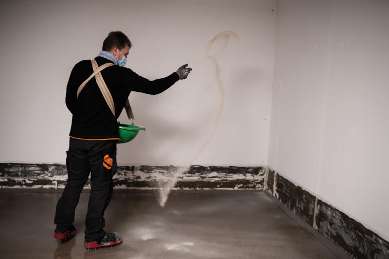 Um beispielsweise Wasserlachen zu vermeiden, war zunächst der Einbau von Hohlkehlen, Keilen und Anrampungen im Übergang zu aufgehenden Bauteilen notwendig. Die Verarbeiter verwendeten hierfür die 2- komponentige Epoxi-Grundierung PCI Apoten OS P sowie Quarzsand inklusive vorheriger Grundierung.