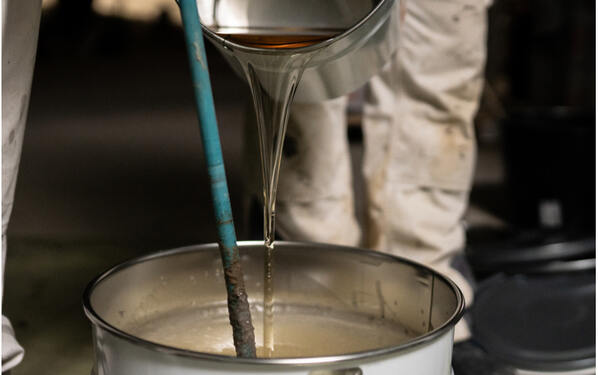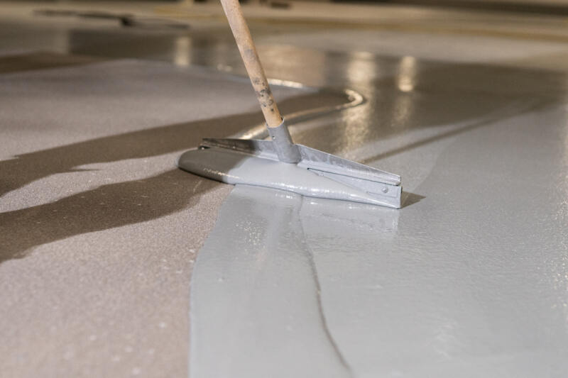 Als 2K-Epoxi-Deckschicht verwendeten die Verarbeiter PCI Apoten OS TC im System. Um ein homogenes Oberflächenbild zu erhalten, brachten sie das Material zunächst durch Fluten auf, verteilten es dann mit einem Gummischieber und verschlichteten es anschließend durch Rollen im Kreuzgang. Wie die verwendete 2K-Epoxi-Grundierung ist auch die Deckschicht niedrigviskos und lösemittelfrei nach TRGS 610. Das System, bestehend aus der 2K-Epoxi-Grundierung und der Deckversiegelung, ist klassifiziert nach DIN EN 13813 und EN 1504-2. Anschließend bearbeiteten die Verarbeiter alle vorhandenen Anschluss- und Bewegungsfugen. Diese spritzten die Verarbeiter mit dem einkomponentigen Polyurethan-Dichtstoff PCI Elritan 140 mit einer geeigneten Ausspritzpistole aus. Anschließend glätteten sie die Oberfläche mit PCI-Glättmittel. Vorausgegangen waren die notwendigen Vorarbeiten: Vorreinigung der Fugenflanken, Hinterfüllen mit DIN-Polyband, Abkleben der Flanken und Aufbringen der Haftgrundierung PCI Elastoprimer 110.