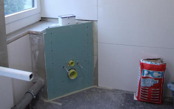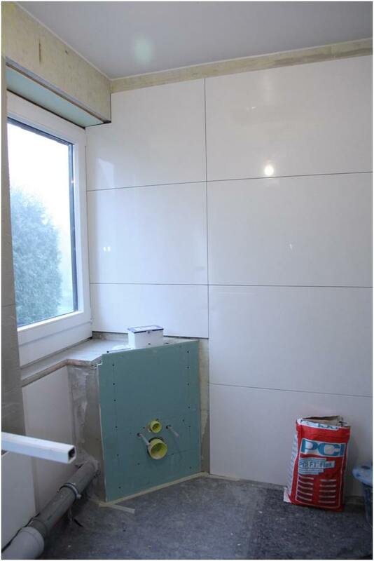 Die Besitzer eines in die Jahre gekommenen Badezimmers in einem Zweifamilienhaus in Mettmann sahen Anfang 2012 die Zeit reif für die Sanierung und damit für frischen Wind in ihrem Bad. Dabei war den Bauherren besonders wichtig, dass ein möglichst pflegeleichter Belag an den Wänden Platz findet. Deshalb fiel die Wahl auf eine italienische Feinsteinzeugfliese im Format 60 x 120 cm. Die Abbruchmaßnahmen sollten möglichst gering gehalten werden und schnell vonstattengehen. So entschieden sich die Verarbeiter in Absprache mit den Bauherren dazu, die neuen großformatigen Fliesen auf dem alten Wandfliesenbelag zu verkleben. Dabei arbeitete der Fliesenlegemeister Johannes van Noppen eng mit den Anwendungstechnikern und Fachberatern des Bauchemiespezialisten PCI Augsburg GmbH sowie seinem Sohn, dem Architekten Philipp van Noppen, zusammen.