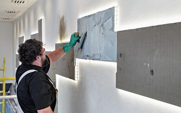 Ein besonderes Highlight im Spa-Bereich der Oberstdorfer Residenz ist das Lichtkonzept: Farbiges LED-Licht, das im ganzen Bereich einheitlich wechselt, verbindet die unterschiedlichen Räume. Das Lichtobjekt im Schwimmbad sollte mit großformatigen Fliesen verkleidet werden. Als Träger dienten mit LED-Technik versehene Multiplexplatten, die an der Wand befestigt waren. Nach Rücksprache mit PCI-Anwendungstechniker Hans-Peter Schmied entschied man sich für den zweikomponentigen Polyurethankleber PCI Collastic, der als Kontaktschicht auf die Rückseiten der Feinsteinzeugplatten aufgezogen und auf die Multiplexplatten aufgekämmt wurde. Mit PCI Collastic erfolgte anschließend das Verlegen „frisch in frisch“.