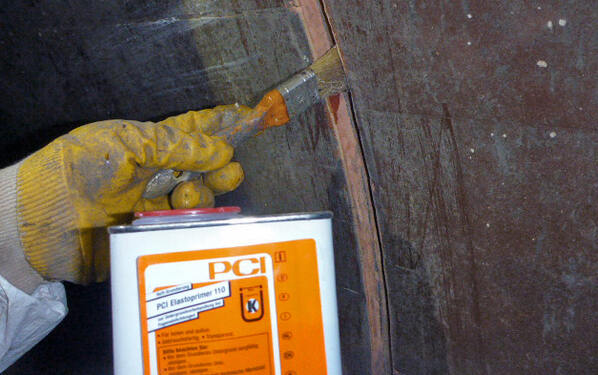 Bei der Verarbeitung des Dichtstoffs in Fugen ist darauf zu achten, dass nur eine 2-Flanken-Haftung vorliegt. Zu diesem Zweck brachten die Handwerker die Haft-Grundierung PCI Elastoprimer 110 auf die Fugenflanken auf, um eine funktionsfähige Haftung des Dichtstoffes auf den Innenrändern zu gewährleisten. Jede weitere Haftung am Untergrund kann Spannungsrisse zur Folge haben und die Dichtheit der Fugen gefährden. Um Dreipunkthaftung zu vermeiden, kam PCI DIN-Polyband zum Einsatz. Die Handwerker drückten das PE-Hinterfüllmaterial aus Polyethylen in die Fugen. Es entspricht den Vorgaben nach DIN 18 540.
