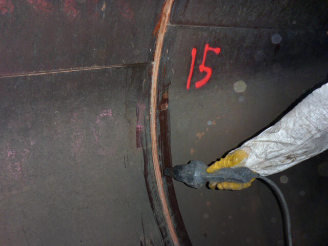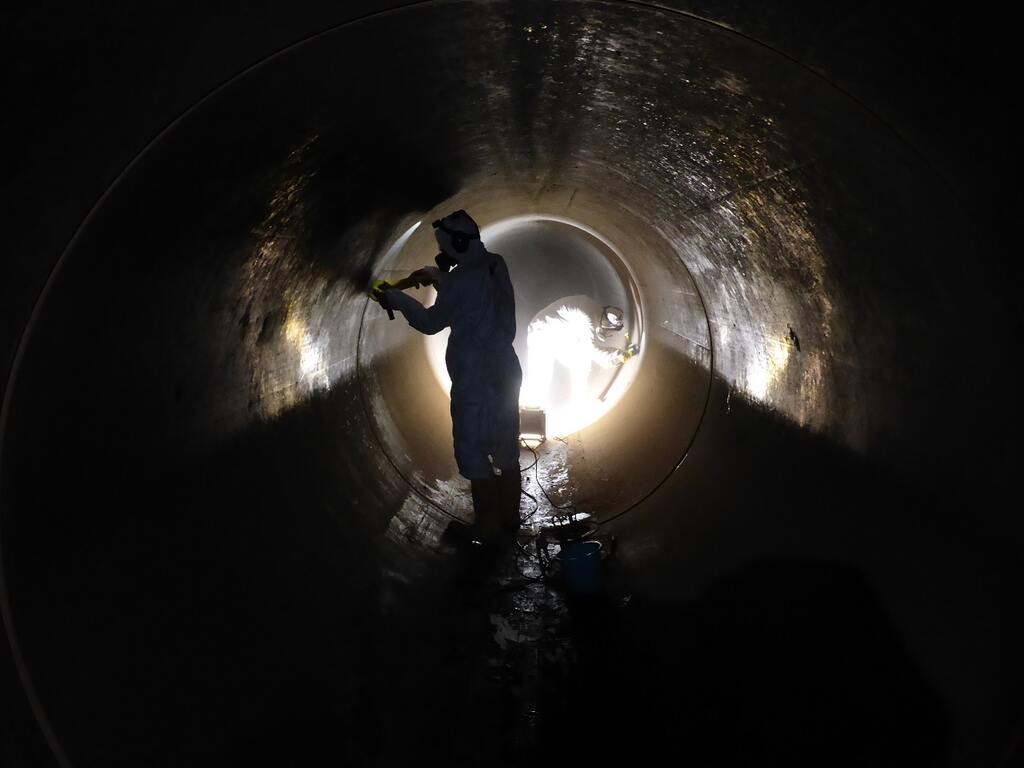Um die Sanierungsarbeiten starten zu können, verschloss die STRABAG die Rohrtrasse zunächst mit einem Ballon. Zuvor war das Mischwasser umgeleitet worden. Dann machten sich drei Mitarbeiter der Abteilung Kanaltechnik und Rohrleitungsbau an den Rückbau der undichten Fugen. Ausgerüstet mit Schutzkleidung und Stirnlampen rissen sie das alte Fugenmaterial abschnittsweise mit der Hand heraus und reinigten die freiliegenden Fugen von jeglichen Rückständen. Dabei stießen sie auf rückseitig durchfeuchtete Stellen. Damit die neuen Fugenverschlüsse dauerhaft dicht sind und sicher haften, musste STRABAG im nächsten Arbeitsschritt die Rücktrocknung durch Einblasen von Warmluft sicherstellen.