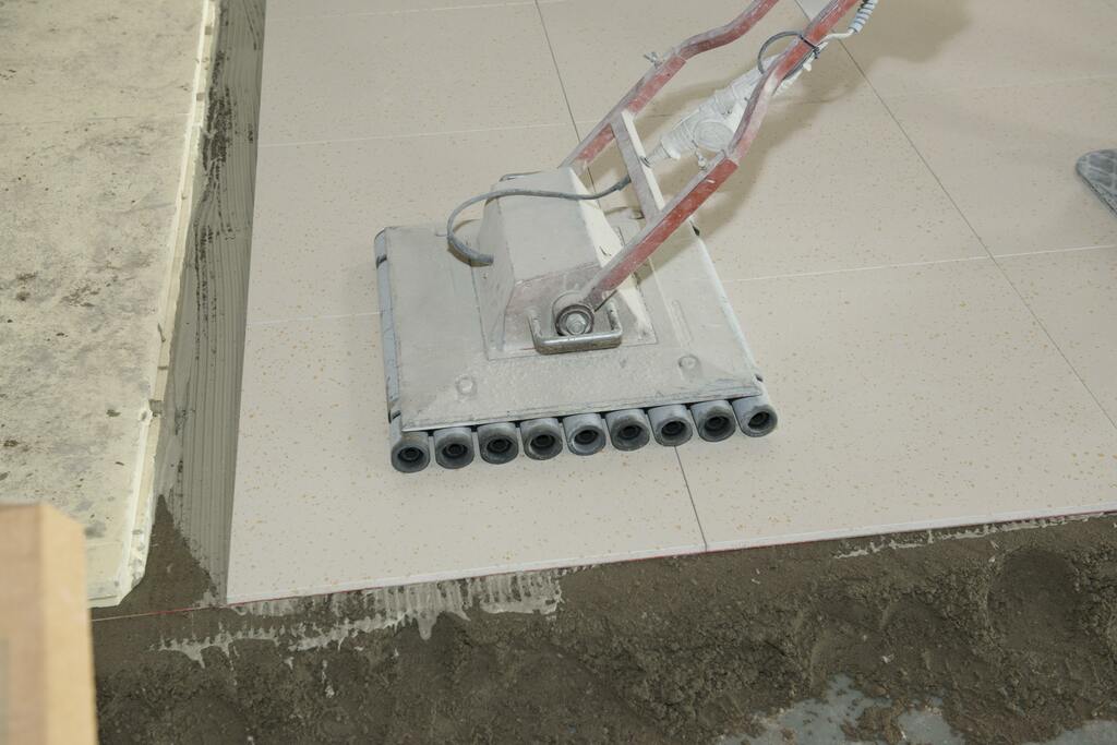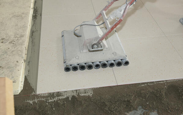 Nach Abkehren der verlegten Fliesenfläche erfolgte zeitnah das Abrütteln, denn grundsätzlich gilt: Je eher abgerüttelt wird, umso fester und haltbarer ist der Fliesenbelag. Vorteilhaft ist auch das zügige Verfugen. Verwendet wurde hierfür der flexibilisierte zementäre Fugenmörtel PCI FT Megafug. Der geschmeidige Mörtel ist einfach zu verarbeiten und eignet sich für Fugenbreiten von 2 bis 15 mm. Mit dem elastischen Silikondichtstoff PCI Silcofug E wurden Eck-, Anschluss- und Bewegungsfugen geschlossen.