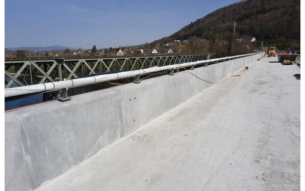 Die Rheinbrücke Hemishofen verbindet die Kantone Thurgau und Schaffhausen miteinander. Die 345 Meter lange Strassenbrücke ist der einzige Brückenübergang zwischen den beiden Kantonen. Sie ist die grösste Brücke im Kanton Thurgau und wurde in den Jahren 1978-1980 erbaut. Über die Jahre haben Frost-Tausalz-Einwirkungen sichtbare Spuren an Betonbrüstungen und Fahrbahnplatte hinterlassen, eine Sanierung war nötig geworden. Dazu wurde an den Betonbrüstungen und der Fahrbahnplatte der geschädigte Beton mittels Wasserhöchstdruck abgetragen und Instandsetzungsmörtel PCI Nanocret R4 SA als Betonersatz oberhalb der Bewehrung aufgebracht. Als Hydrophobierung kam unsere Tiefenhydrophobierung PCI Silconal 328 zum Einsatz.