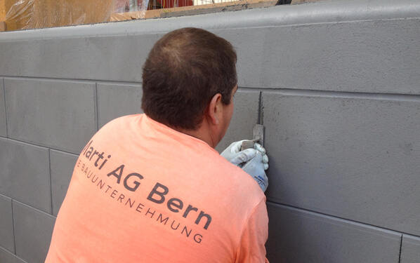 Das wahre Ausmass der Instandsetzung kam erst zum Vorschein, als die verrissene und nicht mehr tragfähige Substanz entfernt war. Der Betonabtrag erfolgte durch Spitzen, weil der Beton bereits so stark zerstört war, dass er so ohne grosse Lärmemissionen entfernt werden konnte. Am übriggebliebenen Bauteil konnte die ursprüngliche Mauer fast nicht mehr erkannt werden. Hingegen lag eine sehr raue Oberfläche vor, die ideal für den Auftrag eines Reparaturmörtels im Spritzverfahren war.
