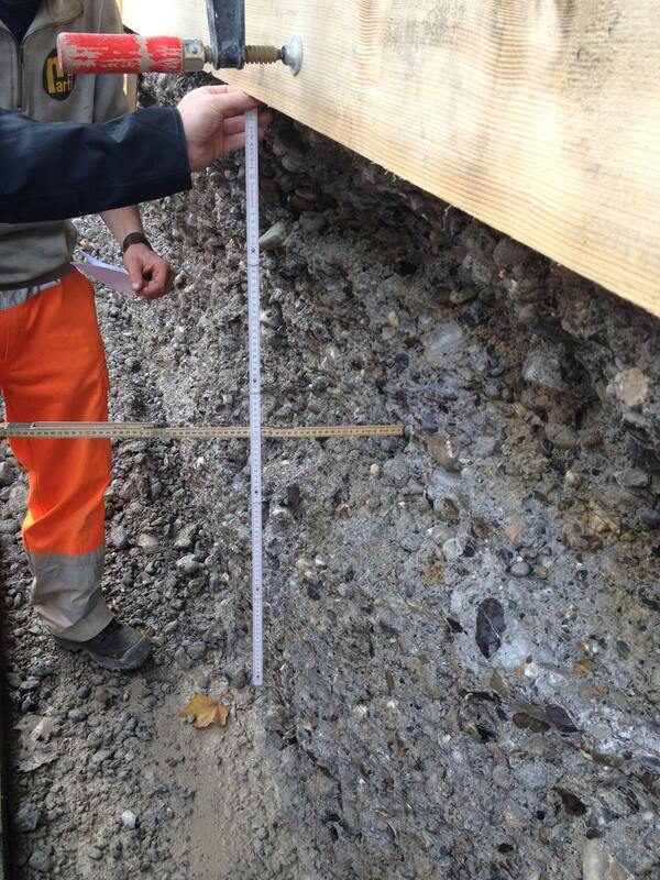 Hinten und vorne wurde rund um die Mauer der Asphalt freigelegt, so konnte die Mauer bis unter die sichtbare Endhöhe des Belages erstellt werden und der Belag anschliessend an das Kunstwerk herangezogen werden. So entsteht der Eindruck, wie wenn die Mauer aus dem Boden herauswächst bzw. darin verschwindet.