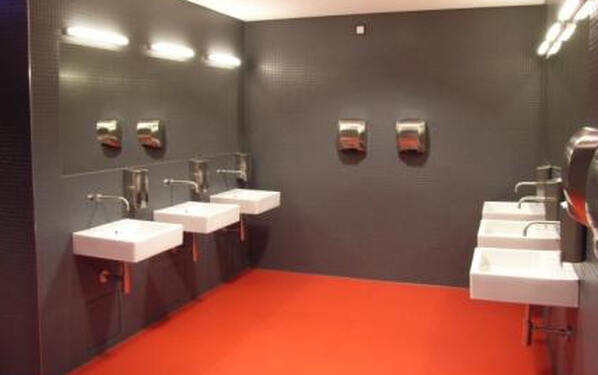 Neben dem Eingangsfoyer als Dreh- und Angelpunkt der neuen Stadthalle gingen die Bauprofis auch in Umkleide- und Sanitärräumen sowie im Küchen- und Lagerbereich ans Werk. Das Team der UHNAG GmbH verlegte etwa 1.400 m² keramisches, 2,5 x 2,5 cm großes Mosaik von Villeroy und Boch mit Hilfe von PCI FT Klebemörtel in den Sanitärräumen. Bei der Verfugung entschieden sich die Fachhandwerker für den variablen Flexfugenmörtel PCI Nanofug. Dieser besticht durch seine wasser- und schmutzabweisende Oberfläche sowie die leichte Reinigung dank des easy-to-clean-Effekts. Bevor der Oberbelag in Küche und Lagerräumen verlegt werden konnte, dichteten die Bauprofis den Untergrund mit der wasserdichten und rissüberbrückenden Abdichtungsbahn PCI Pecilastic W sowie der flexiblen Dichtschlämme PCI Seccoral 1K ab. Damit schafften sie eine sichere Basis für die nachfolgenden Fliesen, die mit dem leichten Flexmörtel PCI Nanolight fixiert wurden. Für die abschließende Verfugung verwendeten die Bauprofis den zementären Spezial-Fugenmörtel PCI Durafug NT. Da gerade in gewerblichen Küchen mit großer Sorgfalt auf die Hygiene und Sauberkeit geachtet werden muss, ist diese Fuge sehr empfehlenswert. So ist sie besonders widerstandsfähig gegenüber sauren Reinigern und Hochdruckreinigerbelastungen bis 100 bar.