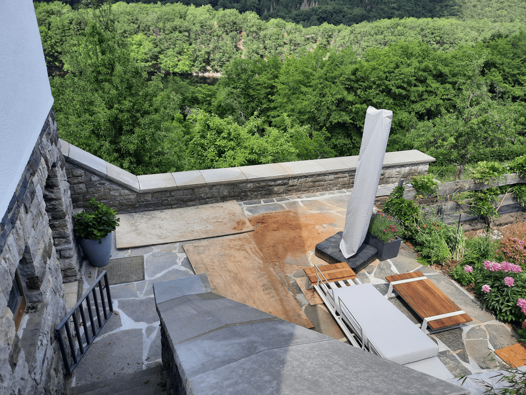 Inmitten der malerischen Kulisse der Nordeifel erhebt sich die eindrucksvolle Urfttalsperre, ein imposantes Bauwerk von historischer Bedeutung. Die Staumauer, die zwischen 1900 und 1905 errichtet wurde, erstreckt sich über 226 Meter und ragt 58,5 Meter in die Höhe. Ihre Hauptaufgabe besteht darin, die Urft aufzustauen und den Urftstausee zu formen. Im Zuge einer notwendigen Baumaßnahme wurden hier – in einem privat genutzten, öffentlich nicht zugänglichen Bereich – insgesamt 53 Meter Mauerabdeckungen aus robustem Grauwacke-Naturstein neu verlegt. Jede einzelne dieser Abdeckungen ist eine Sonderanfertigung und wiegt beachtliche 60 Kilogramm. Derartig massive Platten mit einer Stärke von 7 bis 10 cm dienen als Witterungsschutz der hinterlüfteten Außenverkleidung. Die Herausforderung der Erneuerung lag darin, den Untergrund, der aus einer Kombination von Beton, Bruchsteinmauerwerk und reinem Bruchstein bestand, angemessen vorzubereiten, um die Mauerabdeckungen sicher und dauerhaft zu installieren.