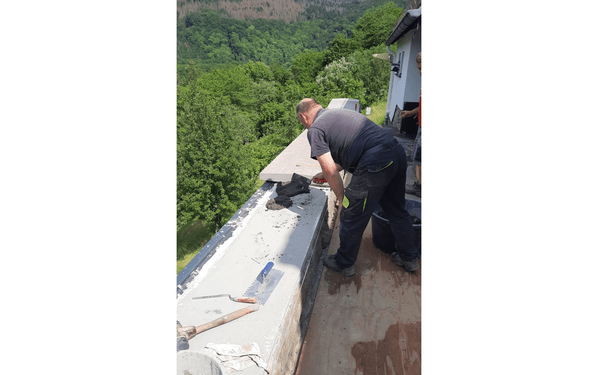 Um eine gleichmäßige Ebene zu gewährleisten, trugen die Handwerker die zementäre Mörtel-Haftbrücke PCI Repahaft auf den vorbereiteten Untergrund auf. Darauf folgte die Anwendung von PCI Novoment M3 plus, um eine Schichtdicke von etwa 40 mm zu erreichen. Der Fertigmörtel eignet sich hierfür ideal, da er sogar Schichtdicken von bis zu 80 mm erlaubt. Nach einer Trocknungszeit von drei Tagen waren die Voraussetzungen geschaffen, um die Mauerabdeckungen sicher zu installieren.