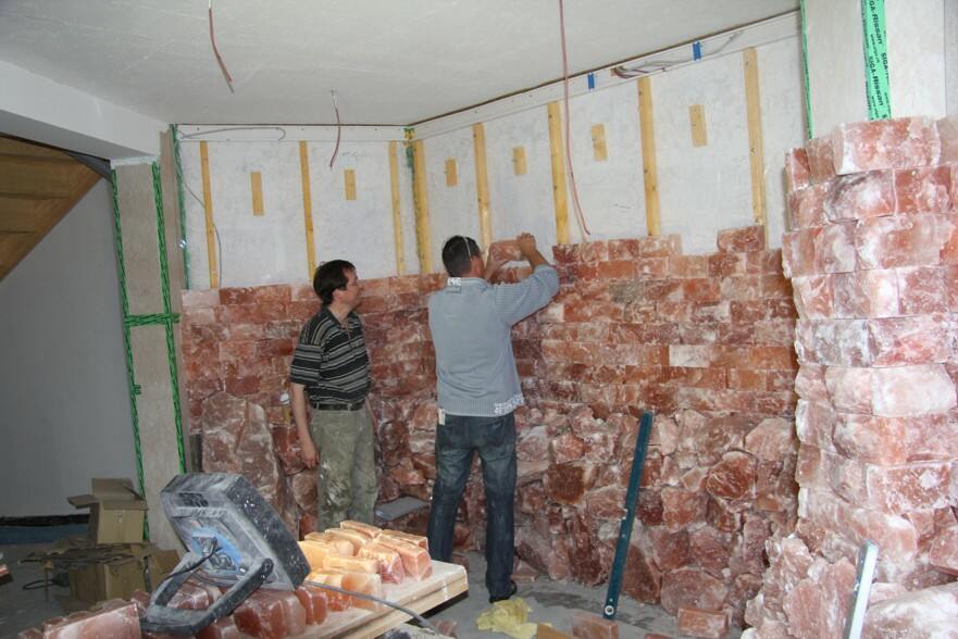 In Trinwillershagen, not far from the Baltic coast, Karin and Axel Günther have built a wellness oasis made entirely of salt. A salt crystal was the model for the 16-cornered ground plan of the Salztürme (salt towers), covering an area of about 100 m2. They had 38 tonnes of salt imported from Pakistan for the interior covering. 32 tonnes were installed as tiles, blocks and bricks. On the ground floor and the first floor, salt slabs with a red sheen and irregular quarry stone masonry were to cover the walls and floors. For the massage and wellness area on the second floor, the owners opted for translucent, almost white halite salt.