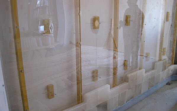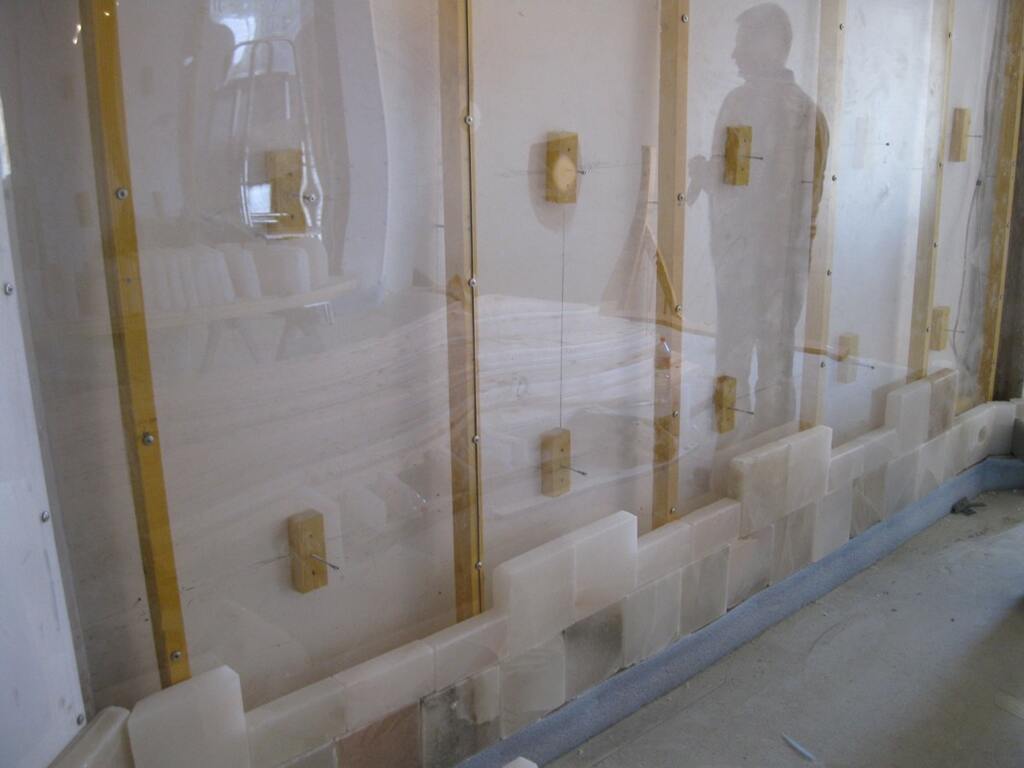 The processing of these natural stone materials represented a real challenge, especially as the wall covering was to be backlit. The team of owners, contractor and PCI advisers could not call upon a great deal of experience with the laying of salt slabs. Like the acrylic glass substrate, the tile adhesive needed to be transparent at the same time as offering considerable adhesive strength and being inert to the chlorides in the natural salt. Conventional tile adhesives could therefore not be used. With the expert support of PCI adviser Götz Hirseland and PCI application technician Andreas Albert, the project was realized as follows.