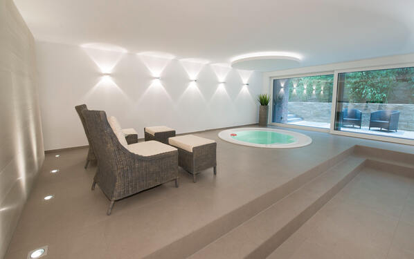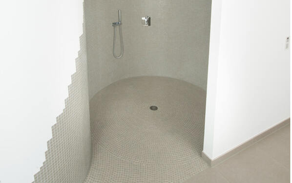 The staircase between ground floor and the cellar is tiled with 60 x 120 cm porcelain stoneware cut exactly to the dimensions of the steps. The rooms in the cellar and the bathroom in the guest apartment integrated in the cellar were tiled with 60 x 60 cm and 60 x 90 cm porcelain stoneware. At its heart lies the elaborate spa area which includes a 350 x 350 cm large jacuzzi and a round shower. Wyß first primed the screed with PCI Gisogrund Rapid. PCI Rapidlight was then used to apply an adhesive layer for the PCI Pecilastic U waterproofing and isolating membrane. The joins between the membranes were covered with PCI Pecitape 120 and PCI Seccoral 2K Rapid, as were the base areas and connections such as to the pool. The tiling professionals used PCI Lastogum on the primed wall substrate. The two seals were joined along the base area with sealing strips. The expansion joints and the connections between the wall and floor were sealed with PCI Silcoferm S and then grouted with the versatile PCI Nanofug grout.