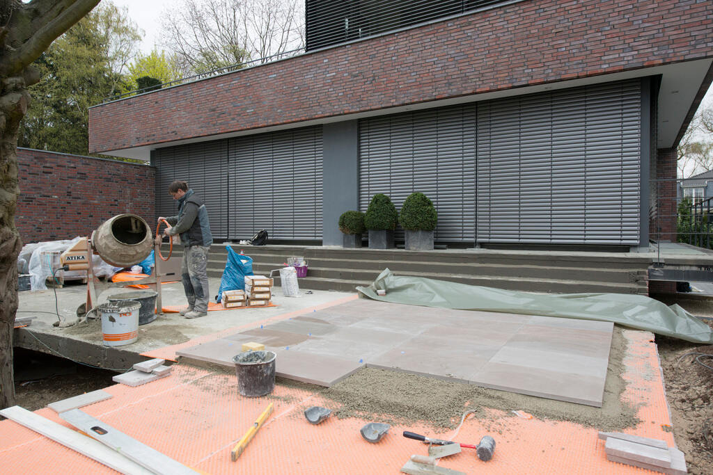 In the spacious living area on the ground floor of a town villa in Krefeld, large, floor-length windows allow in plenty of natural light. The high-quality natural stone flooring gives the impression of spaciousness and airiness, linking the interior to the outside. A total of 400 m2 of calibrated blocks of quartzite natural stone were laid: 200 m2 in the living area and 200 m2 on the patio. The continuous 50 x 80 cm format is 2 cm thick inside, and the regulatory 3 cm thick outside. The contractor Benjamin Wyß and two of his appointed sub-contractors first tiled the bathrooms. The screed was then primed with PCI Gisogrund to seal it and prevent it from being affected by moisture. The professionals laid the 1 cm thick porcelain stoneware tiles (60 x 120 cm) on the wall and floor of the bathroom on the first floor with PCI FT Flex. The bathroom and the guest toilet on the ground floor were tiled with a natural stone covering in keeping with the general tiling concept on that floor using PCI Carraflott NT. PCI Carrafug was then used to grout the joints.