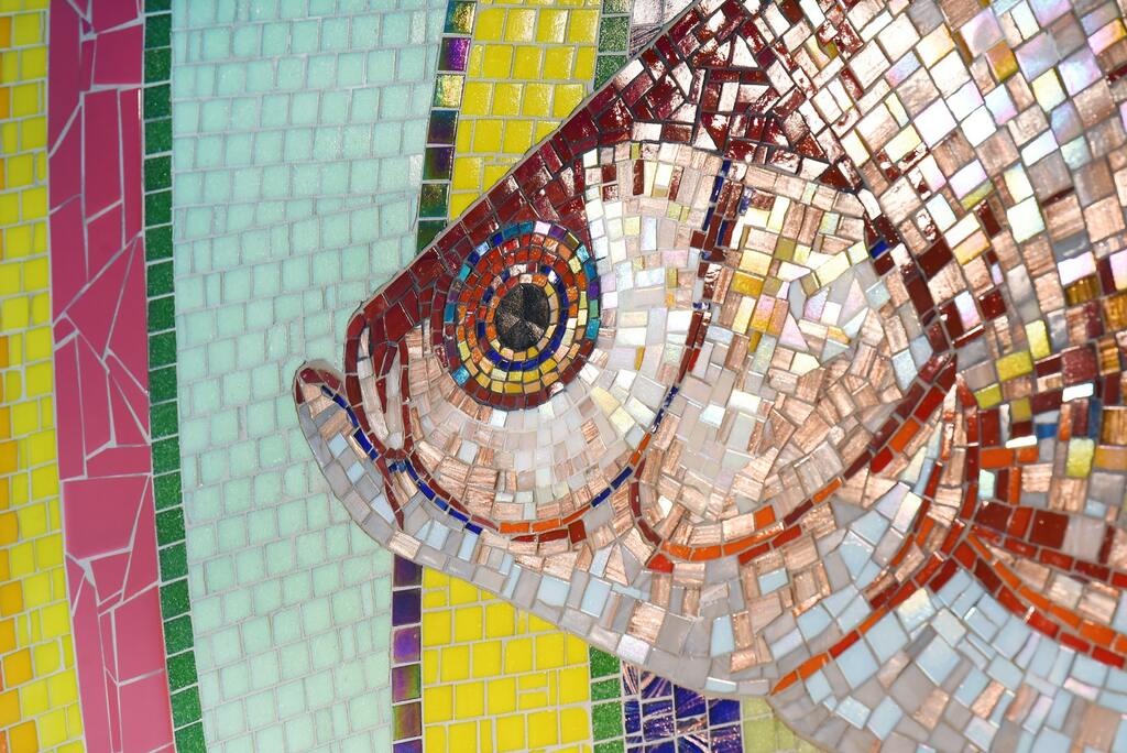 Following the designs of the artist Paul Wieggers, he laid the glass mosaics with up to 80 different colors on Kerlite boards with a thickness of 3.5 centimeters in his workshop. Harbers then assembled and grouted the finished motifs on site. This was a time-consuming project. Each fish motif required about 200 hours of work.