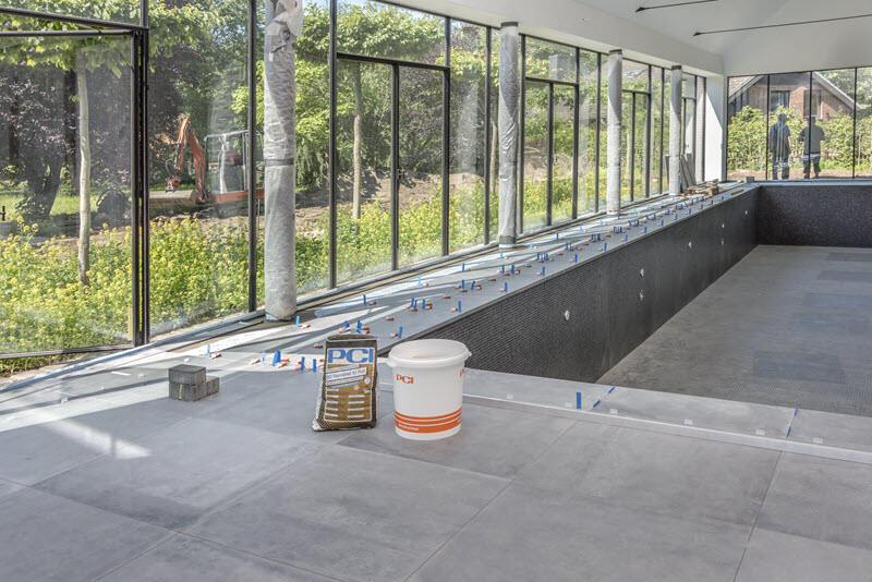 First, the 4 x 17 m GRP pool with pre-installed grey glass mosaic tiling was lowered into the spa building, with a floor area of about 230 square meters, using a special crane. For tiling, including waterproofing, adhesive bonding and grouting, PCI application technician Eric Peter made a recommendation for the sequence and selection of system products. PCI adviser Thomas Rauls provided project support and made several visits to the site.