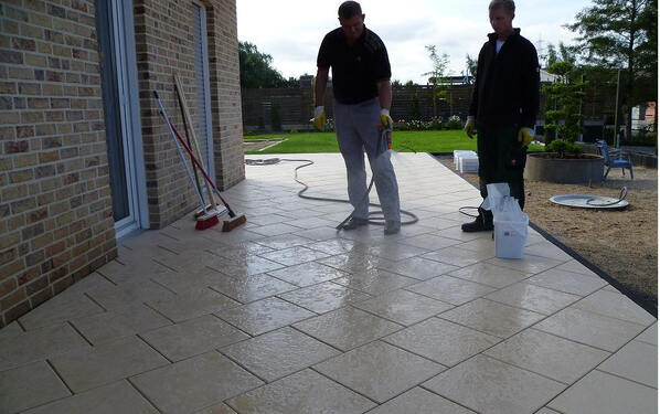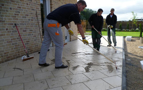 The 160 sq m concrete flagstones made by KANN (40*40*3cm, sealed ex works), were laid on a loose chippings bed by the company Hohen GbR Gartenservice at family Radke’s. Grouted concrete upstands along the boundaries of the flagstones were placed in order to avoid undesirable shifting. The joints were blown-out to get the necessary joint depth and then the surface and the edges of the concrete flagstones were generously pre-wetted. This had to be done carefully to avoid undesirable water remains in the edges. Afterwards, the gardening experts applied the paving joint grout Pavifix 1K Extra using also jets of water to support the action of inserting the grout into the joints by means of hard rubber squeegees. Half an hour after elutriating the joint grout, the concrete stone with its chamfered edges had to be swept in a diagonal pattern across its surface using a slightly wetted coco broom. As a result, the grouting is found only on the joint groove and not on the chamfered surface of the concrete stone. In this way, a smooth, crack-free surface is created.