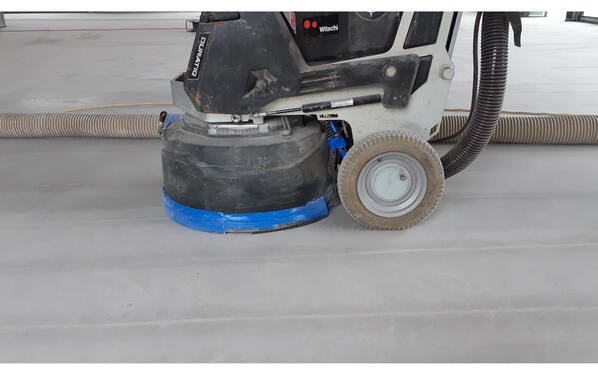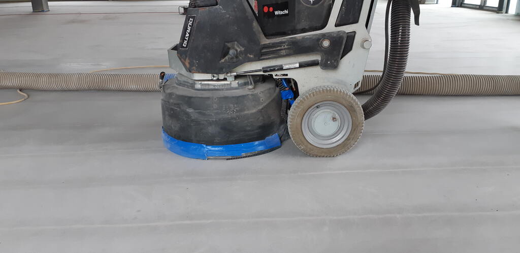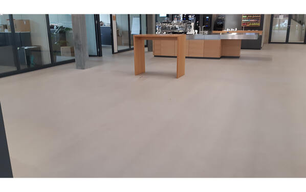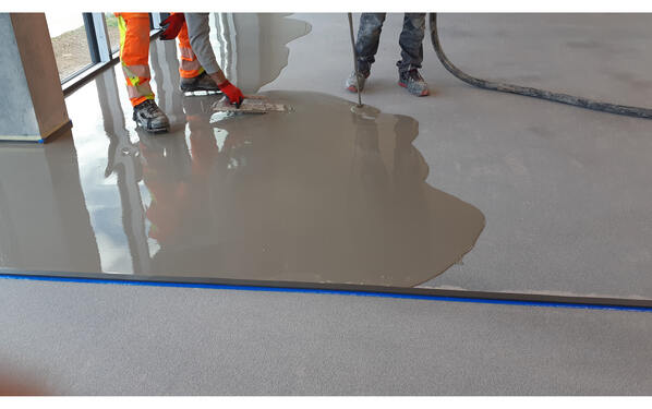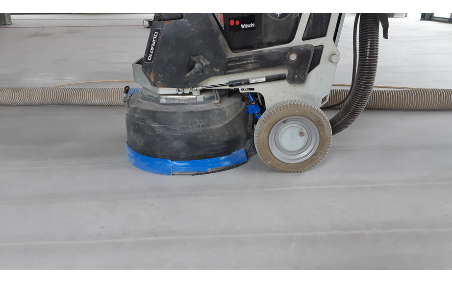 Die Untergrundvorbehandlung erfolgte mittels Schleifen. Der Verarbeiter grundierte mit der Spezial-Grundierung PCI Epoxigrund 390 die Zementestriche und Kanalabdeckungen. Für die Haftung des nachfolgenden Bodenbelags war es wichtig, die Spezial-Grundierung mit feuergetrocknetem Quarzsand im Überschuss abzusanden.