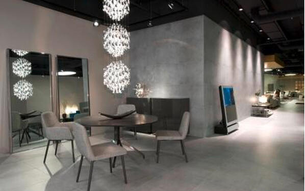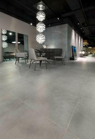 First of all, to ensure proper adhesion for the new tiles, the floor had to be completely sanded. After that it was ready for the application of the special primer PCI Epoxigrund 390 and quartz sand (grain size 0.3 to 0.8 mm). Large-size tiles were installed on the prepared floor and wall spaces. The client selected plates of the Microment series, Apavisa brand in grey colour. They now cover the floor in 60 x 60 cm squares and the wall in 60 x 120 cm rectangles. To ensure the bond between substrate and tile, the building specialists relied on the fast-acting and lightweight flexible adhesive PCI Rapidlight. The joints of the tiles were ready for grouting with the new geopolymer high-convenience ceramic joint PCI Geofug after only three hours. As in the case of accessories, which provide a balanced support to the presentation of the exhibited furniture, utmost care was taken with the floor and wall covering to create perfect harmony, down to the smallest detail. This is why the choice fell on PCI Geofug joint, which gives a coherent impression of floor and wall due to its ceramic-like surface. Another benefit of the joint: Any residual dirt or certain types of mould automatically decompose on the PCI Geofug surface when exposed to light. Last but not least, the existing corner and connection joints were sealed with the elastic silicone joint sealant PCI Silcoferm VE - naturally in the corresponding shade of cement-grey.
