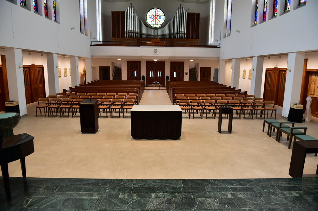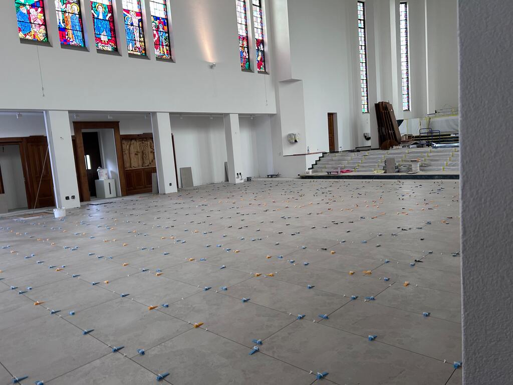 Vor der Verlegung wurde der bestehende Untergrund sorgfältig vorbereitet, grundiert und mit PCI Pericret ausgeglichen. Besondere Aufmerksamkeit galt dabei dem Schutz der vorhandenen Holzverkleidung und des sakralen Inventars. Das Ergebnis ist ein heller, harmonischer Bodenbelag, der das natürliche Licht des Kirchenraums optimal aufnimmt und die architektonische Struktur betont.