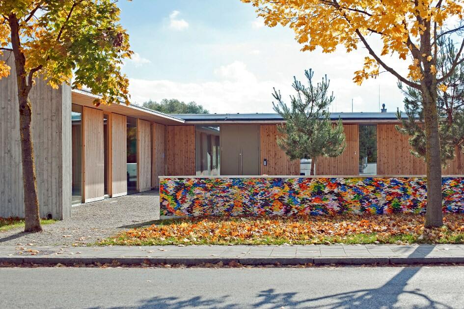 The Ingeborg-Ortner-Kinderhaus, opened in October 2010, offers places in a kindergarten and day nursery for the children of university staff and students at TU München. The construction costs in the amount of 1.6 million euros were donated by the Munich couple Ingeborg and Johannes Ortner. The architect professor Hermann Kaufmann shaped a building inspired by state of the art timber construction technology. With the Lego brick wall in the entrance area, the artist Tina Haase, professor of visual arts at the school of architecture, created the corporate identity of the kindergarten. At the same time, she thereby set a signal for the University of Technology, for its recently intended commitment in favour of women and children, as well as for modern contemporary architecture and creative innovation. Prof. Haase chose the “Lego” material because of its striking colours and fitness for the purpose of cladding the parapet which has to withstand all weathers. At the interface between inside and outside, between the children’s world and the world of the grown-ups, the material evokes memories of old longings, and thanks to its extremely picturesque scintillating qualities it creates energy and vigour.