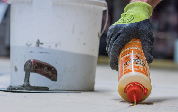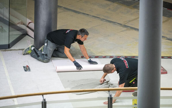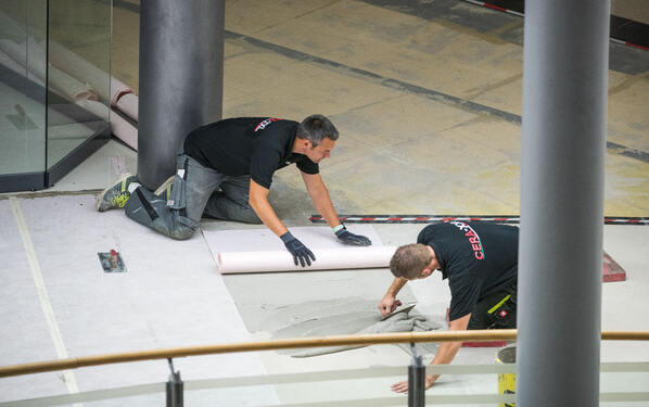 The first step was to mill and grind the existing concrete stone covering. Hollows were repaired and joint gaps were filled with odourless PCI Apogel SH silicate casting resin. The surface was then primed with PCI Gisogrund 303 and level markers were positioned for the levelling layer. In order to compensate for later stress and cracking of the substrate, the craftsmen laid PCI Pecilastic isolating underlay on the prepared substrate using highly elastic PCI Flexmörtel S2 Rapid adhesive.