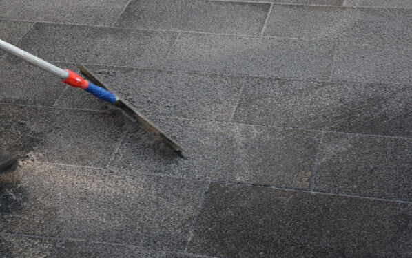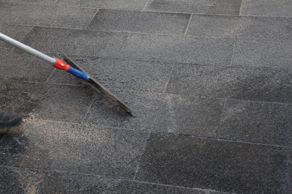 The paving tiles "Granite COLOMBO anthracite – grey" (60 x 30 x 3 cm) were laid over an area of about 50 m², on top of the existing basaltic concrete slabs. The jointing process entailed the client to soak the surface with water the previous evening and then the following day four men carried out the work using PCI Pavifix 1K Extra within two and a half hours, which included preparation and finishing. Using a rubber-lipped squeegee the landscape gardeners incorporated the paving grout adding water continuously to prevent the joints collapsing. The connecting joints to sewer connections were also filled in with PCI Pavifix 1K Extra. Roughly ten minutes after filling in the joints, the Hirschelmann staff swept the freshly grouted paving area with a damp coconut broom. After about two hours they were able to remove the last grout remains. The client seemed extremely pleased with the overall appearance of his new terrace. He had not expected that such a long-lasting attractive and weed-free paving area could be grouted so professionally in such a short time.
