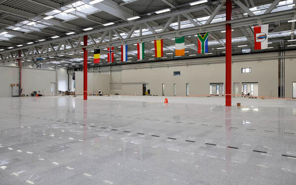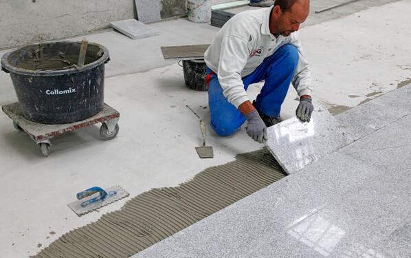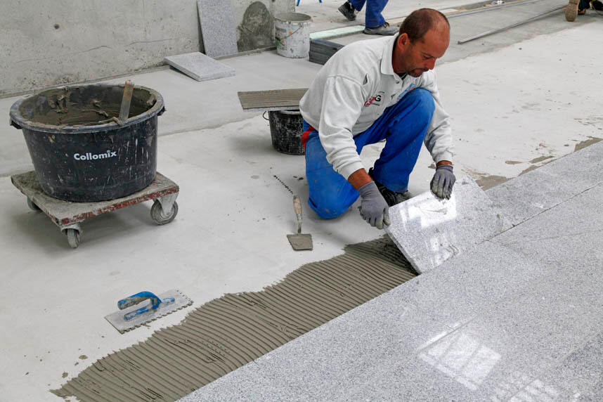 Bei der Erweiterung seiner Firmengebäude setzte das Unternehmen Bausch + Ströbel, Hersteller von Verpackungs- und Produktionssystemen für die pharmazeutische, kosmetische und chemische Industrie, auf die natürliche Variante und entschied sich für die Ausstattung der neuen Montagehalle mit Naturwerkstein. Insgesamt galt es, von Mai bis Juli 2012 eine Fläche von rund 5.000 m2 mit Granit-Platten mit polierter Oberfläche im Format 60 x 30 x 2 cm auszustatten. Der Bodenbelag in der Montagehalle muss durch den Staplerverkehr teilweise einer Belastung von bis zu 15 Tonnen standhalten - es galt also, einen homogenen Aufbau zu schaffen, der trotz der empfindlichen Granitplatten eine enorme Haltbarkeit gewährleistet.