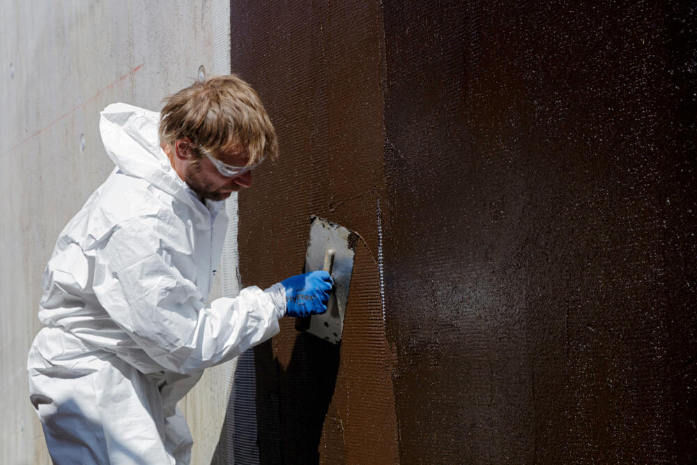 The PCI Pecimor system was used for the exterior waterproofing of the underground parking garage walls. This polymer-modified thick bituminous coating (PMBC) needs the waterproofing requirements of DIN 18533, Part 3, and offers security as a result of the individual products which have been tested as a system and are harmonized with each other. The substrate was prepared using PCI Pecimor Betongrund primer. The exterior waterproofing itself consists of two coats of PCI Pecimor 2K with a fabric layer inserted between the coats. The thick bituminous coating is fit for service in water exposure classes W1-E to W4-E. For exposure classes W1-E and W4-E, the system also includes PCI Pecimor 1K as an alternative product. The benefits of the two thick bituminous coating products include high yield and extremely convenient use. Thanks to the homogeneous polystyrene filler which is used, they can be applied easily and almost effortlessly. Good anti-sag properties ensure homogeneous application. This way, the coating thickness required by the standard is reached reliably. After the application of the first coat, PCI Gewebebahn fabric is inserted, followed by the second coat. The two bituminous products have been tested by external institutes and are not dissolved by soft rainwater.