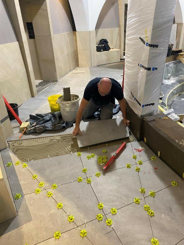 The individual cut-to-size fitting pieces had to be laid over the entire surface and positioned very precisely without excess laying mortar rising up in the joint chambers. The experts used the flexible tile adhesive PCI Flexmörtel S1 Flott particularly suitable for laying large-format fully-vitrified tiles on the floor and combining a very long working time with very fast-setting properties. Its stable adhesive bed prevents heavy tiles from sinking in.